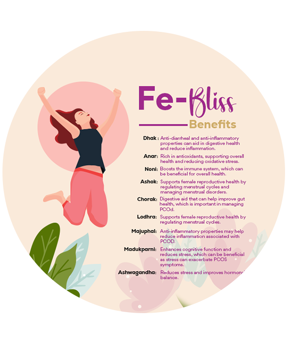 we believe in the power of nature to support menstrual health and well-being. Our period care products, including Fe-Bliss, are meticulously crafted using high-quality, natural ingredients that are safe, effective, and kind to your body.Fe-Bliss incorporates traditional herbal ingredients known for their health benefits, such as Ashok, Noni, Ashwagandha, Lodhra, Dhak, Chorak, Anar, and Majuphal. These natural elements work together to provide soothing and anti-inflammatory properties, helping to alleviate menstrual discomfort and promote overall menstrual health.
