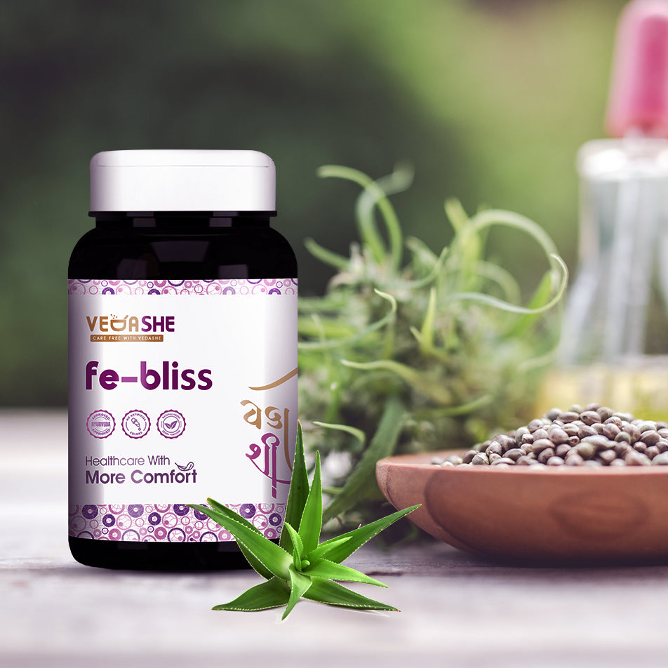 Fe-Bliss incorporates traditional herbal ingredients known for their health benefits, such as Ashok, Noni, Ashwagandha, Lodhra, Dhak, Chorak, Anar, and Majuphal. These natural elements work together to provide soothing and anti-inflammatory properties, helping to alleviate menstrual discomfort and promote overall menstrual health.